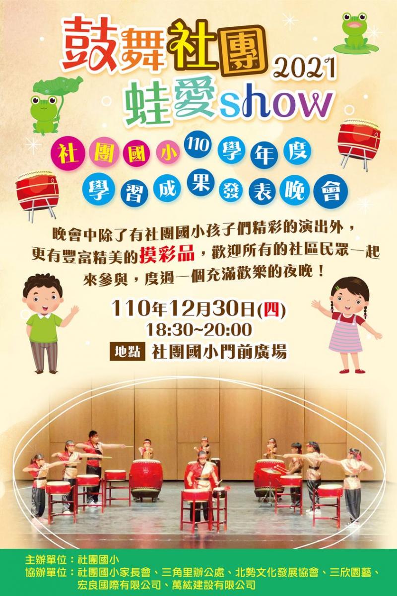 最新消息 DOC快訊 ::: <上一則 返回列表 下一則> #2021鼓舞社團蛙愛Show #110學年度學習成果發表晚會 !12月30日星期四晚上6點半,歡迎你! 發布日期:2021-12-16 人氣:325 #2021鼓舞社團蛙愛Show #110學年度學習成果發表晚會 來囉!來囉!走過路過千萬不要錯過! 「2021鼓舞社團蛙愛Show」學生學習成果發表晚會, 即將在12月30日星期四晚上6點半在社團國小門前廣場登場, 歡迎大家「樓上揪樓下、阿母揪阿爸」相揪來參加~ 晚會中除了有孩子們精彩的表演節目外! 還安排有刺激的摸彩活動,我們準備多樣精美實用的獎品, 保證讓您渡過一個難忘的美好夜晚!, 社團國小全體師生熱情的歡迎大家! 12/30(四)晚上6點半~社團國小等您喔! <上一則 返回列表 下一則>