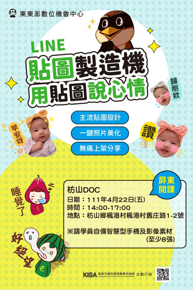 一般人也能自製 LINE 貼圖,不一定要做很厲害的設計,訴求輕鬆、簡單、快速上架。使用相機拍攝的照片,加上喜歡的文字就能製作貼圖。開啟濾鏡功能,即可將畫好的插圖或照片換上不同風格,畫布功能,即可隨手畫出插圖,還可以使用LINE虛擬人像,製作與您相似的貼圖。免費課程機會難得,歡迎有興趣的學員一起來上課!