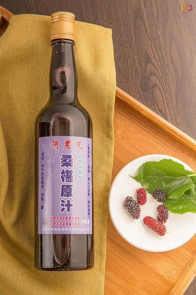 阿農兄說﹔「我堅持只給大家最好的桑葚原汁,用臺灣二砂當天然的防腐劑只加這一樣,連水都不加,提供大家最天然、好喝的原汁。」