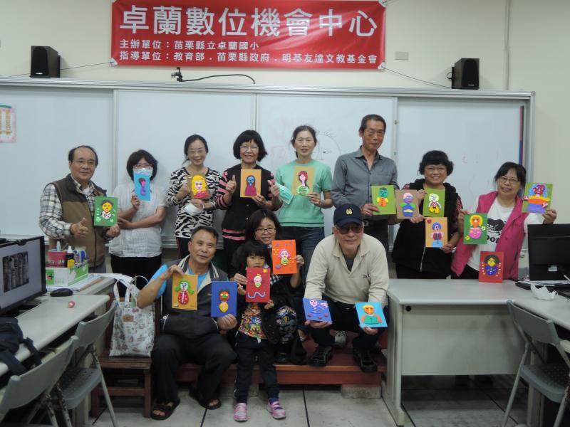 卓蘭DOC學員期待已久的「我的自畫像」在四月份展開,沛晴老師透過投影片的示範引導學員以兩點一線的口訣自信地在紙上畫出自己的畫像。課堂上,活潑的詹老大(詹益誠)一面畫一面用饒平的客語唸著:「阿丁伯~戴目鏡~買了一粒大西瓜~拿三元~找三角~買都一粒地豆殼~滴都雨~地豆霎生角。」沿著順口溜的順序,搭配詹老大繪圖的風格,紙上出現一幅別具特色肖像。