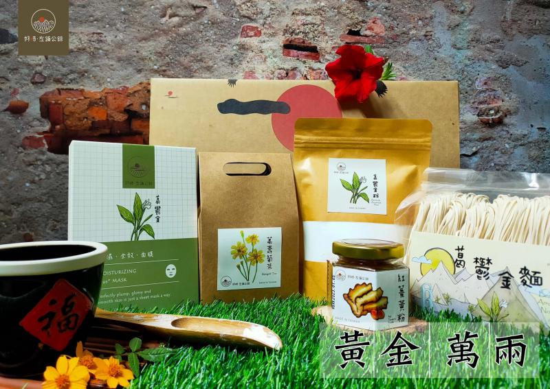 Q彈葛鬱金麵、天然葛鬱金粉、養生薑黃粉、保濕葛鬱金面膜、甘甜萬壽菊茶,通通都在禮盒中