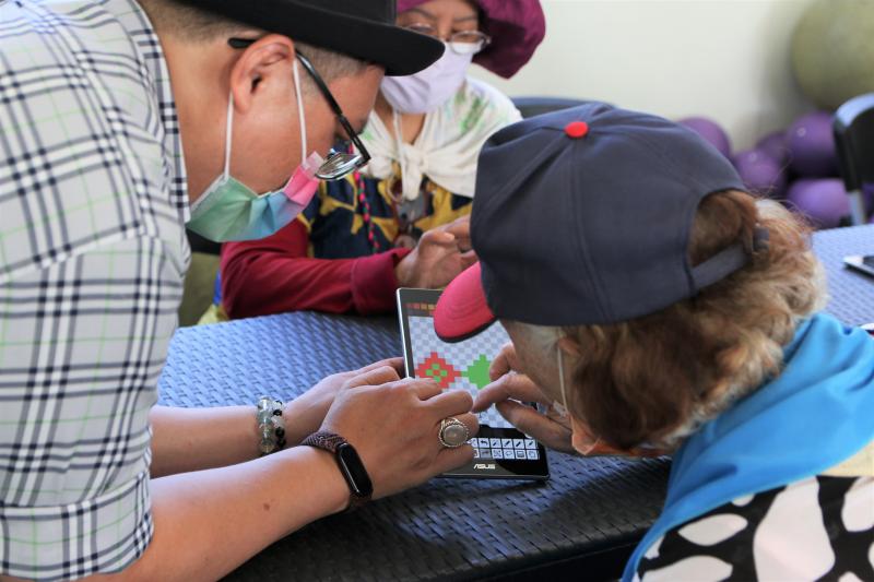 由於學員大多為年長者,第一次使用平板數位工具畫畫的他們覺得很新奇但同時也有些困惑,南駿老師在一旁耐心指導,一步一步介紹繪畫軟體的功能以及小工具的切換。學員們經過認真地學習及練習繪製,看到自己完成作品的那一刻藏不住喜悅,並笑容滿面立即向大家展示:「你們看~這是我畫的」