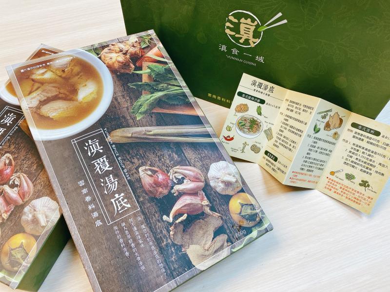「滇覆湯底」冷凍調理包,以水蓼、南薑、馬蜂橙、刺芫荽、胡荽子及月桂葉等香料,搭配豬龍骨熬煮成雲南風味湯底,單包適合3至4人使用。