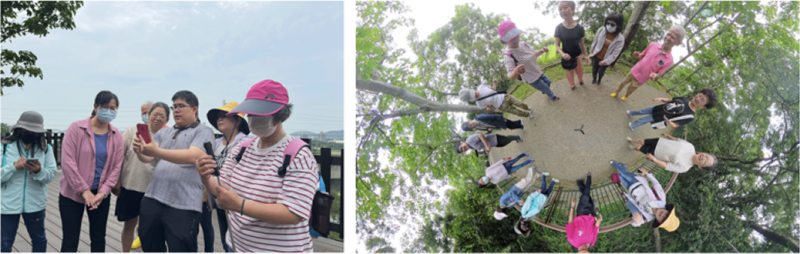 第二堂課更將學習延伸至戶外,師生一同前往外埔桐花步道進行實地拍攝。從自然景觀到人文互動,每位學員都親手操作環景相機,以不同的視角記錄屬於自己的創作片段。大家現場討論腳本、分工拍攝,甚至圍圈唱歌,用笑聲與創意填滿拍攝過程,當手機APP順利連接上360攝影機的那一刻,屬於學員們的360度數位視界也正式開啟。