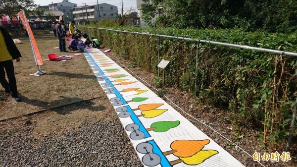 〔記者楊金城/台南報導〕大手牽小手彩繪「趣」,台南六甲林鳳營火車站到林鳳營故事館的100公尺步道,今天在阿公阿嬤、林鳳社區居民、大學生、小學生合作下,彩繪上六甲7種特產,成為六甲輕旅行的亮點。