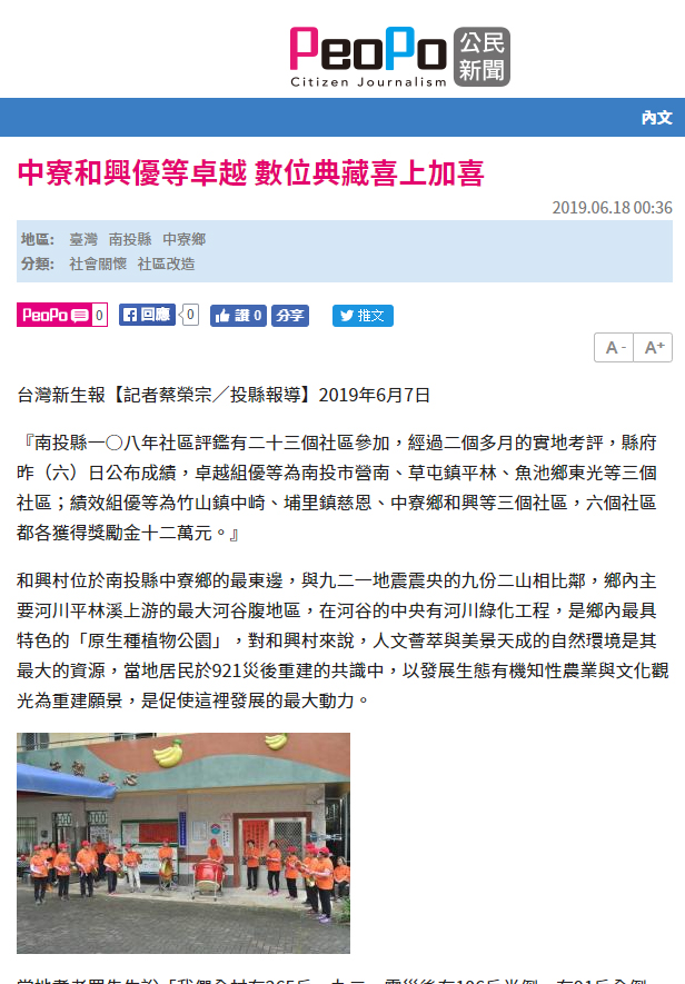 『南投縣一○八年社區評鑑有二十三個社區參加,經過二個多月的實地考評,縣府昨(六)日公布成績,卓越組優等為南投市營南、草屯鎮平林、魚池鄉東光等三個社區;績效組優等為竹山鎮中崎、埔里鎮慈恩、中寮鄉和興等三個社區,六個社區都各獲得獎勵金十二萬元。』