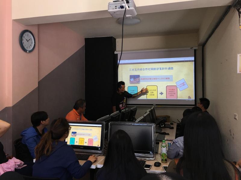 活動照片 精選照片 宣導活動 ::: <上一則 返回列表 下一則> PPT做旅遊介紹 發布日期:2018-06-25 人氣:134 拍攝地點:復興DOC 過去三光五月桃推廣時期,三光五月桃合作社都會推出小旅行活動,讓外地人來到部落,理解部落也體驗一下農民的辛苦。但是部落一直沒有一個好的地方可以坐下來好好跟遊客介紹說明的地方。今年復興DOC開辦,遊客終於有一個好的環境休息,並且在DOC輔導團的協助下,導覽人員首次運用PPT跟遊客們介紹部落,透過精美的PPT,遊客們更能體會到三光五月桃成立的原因跟宗旨,也跟願意持續支持部落! <上一則 返回列表 下一則>