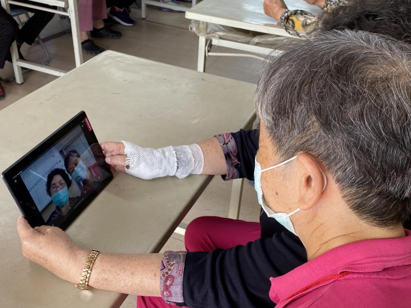 行動平板課程。行動平板來到九如鄉玉泉村,再地銀髮族奶奶未使用過平板,學會自拍後,慢慢抓穩鏡頭和好姊妹一同入鏡。