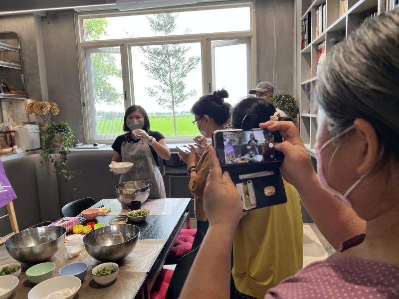 DOC開設的產地到餐桌小農這樣吃課程,學員在採完香菜後,回到教室製作香菜司康,有人拍照、有人錄影,同心協力完成產地到餐桌的影片。