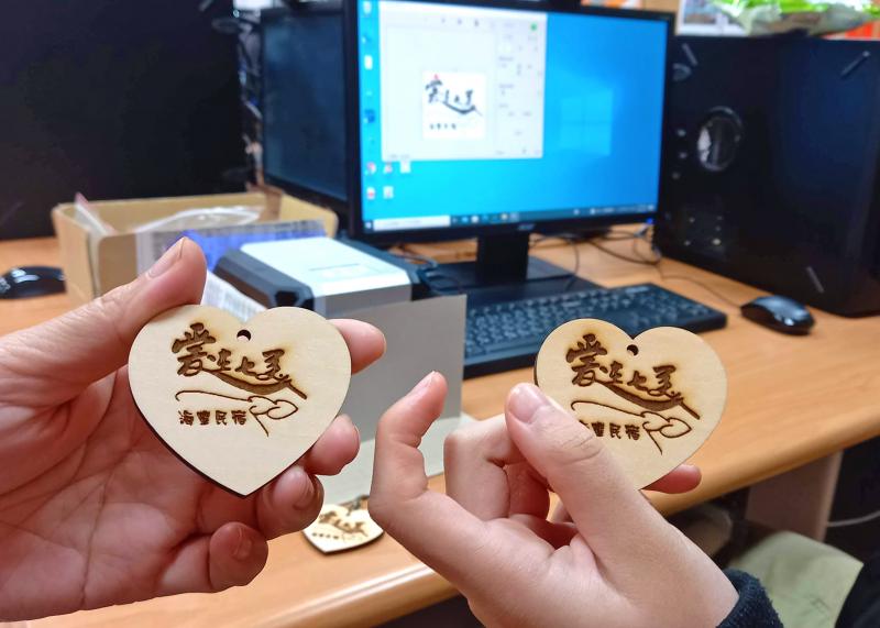 民宿老闆娘參與過DOC雷雕課程後,便有了設計民宿房間鑰匙圈的想法,假日帶著孩子一同來到DOC,借用雷雕機進行設計與雕刻,順利完成漂亮的房間鑰匙圈。