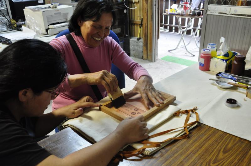 今年她報名馬里光的「數位絹印設計創作班」輔導團課程,在老師與駐點人員兼助教的協助下,為自己的香菇設計了相當簡單的LOGO,學習將LOGO圖案轉印在絹版上,洗去感光劑之後,再將LOGO試印在紙張上,才知道原來上油墨也是需要相當的經驗與技巧,雖然上墨的技巧還有很大的進步空間,而且圖案的設計也很簡單,但Yata Kutu還是非常滿意這樣的成果,因為沒有DOC,她不可能讓她的香菇有了屬於自己的名字與圖樣,所以她興沖沖將輔導團隊提供的胚布裁剪縫貼,做成提袋與揹袋,把LOGO印製在上面,走到哪、揹到哪。