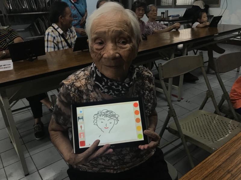 因應學員屬性,在秀湖村的這堂課程除了加長教學時數,在課程的安排上,也以讓老人家活化手部運動及增加學習樂趣的課程為主,課堂上老師教了長輩們用平板看YOUTUBE,搜尋新聞及客家山歌,下午讓長輩們透過繪畫APP用平板畫自己的自畫像,很多有趣的作品和故事發生,包括有越南籍外勞牽著阿公的手畫出阿公的自畫像,還有孫女畫阿嬤,其中最吸引大家目光的是女兒牽著90歲媽媽的手,一筆一畫的繪出媽媽的模樣,俏麗的短髮加上亮麗的紅唇,我能想像阿婆在年輕時有多麼漂亮。