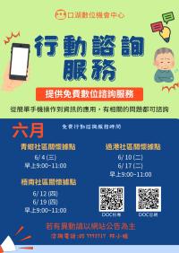 12月行動諮詢服務 免費行動數位諮詢服務,從簡單的手機操作到資訊的應用及行動支付,有相關問題都可來諮詢唷! 諮詢服務項目: 1. 3C設備操作與應用 2. 各類資訊應用技巧 3. 日常生活數位工具應用 4. 行動支付設定與使用 5. 手機安...(詳細內容)